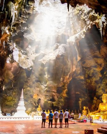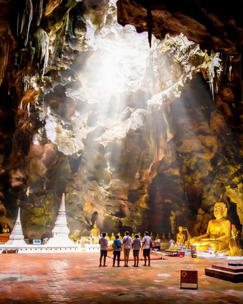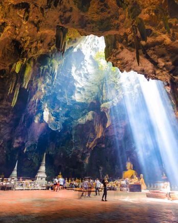 Step into this stunning limestone cavern at Tham Khao Luang Cave to see the natural sunlight streaming through the ceiling, illuminating the golden Buddha images below.